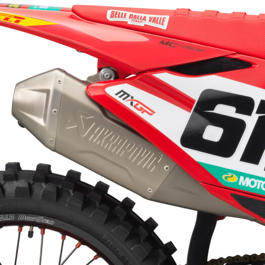 Model MC 450F Factory Edition, který je nezbytný pro stavbu tovární závodní repliky dirtového motocyklu, je vybaven nejnovější verzí tlumiče Akrapovič ‚Slip-On Line‘. Zvyšuje výkon v celém rozsahu otáček a přidává výrazně vyšší točivý moment, přičemž oproti sériovému systému také snižuje hmotnost.