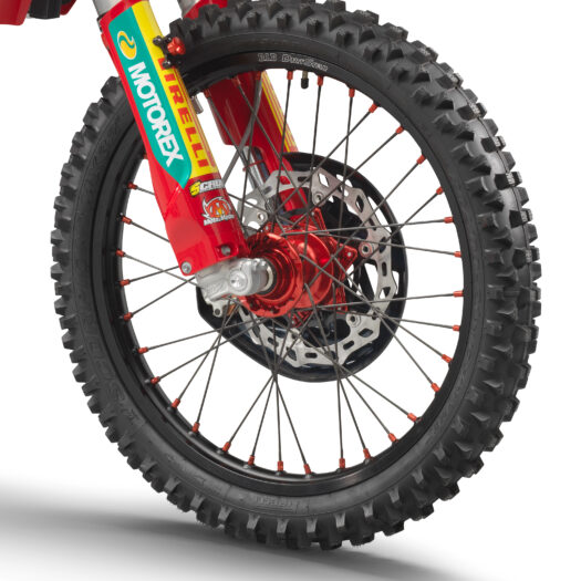Vážně skvěle vypadající a skvěle fungující kola! Díky CNC obráběným, červeně eloxovaným nábojům, superpevným paprskům a ráfkům D.I.D Dirt Star kola Factory Wheels nejen úžasně vypadají, ale jsou také velmi odolná. Navíc jsou červeně eloxované niple paprsků navrženy tak, abyste je nemuseli tak často kontrolovat, což znamená, že zůstanou déle pevné a čerstvé. A abyste měli jistotu, že dostanete výkon na zem a zatočíte jako profesionál, je Prado Edition vybavena stejnými, super přilnavými pneumatikami Pirelli Scorpion™ MX 32™ Mid Soft, které Jorge použil, aby si v roce 2023 zajistil titul mistra světa MXGP. Pěkné!