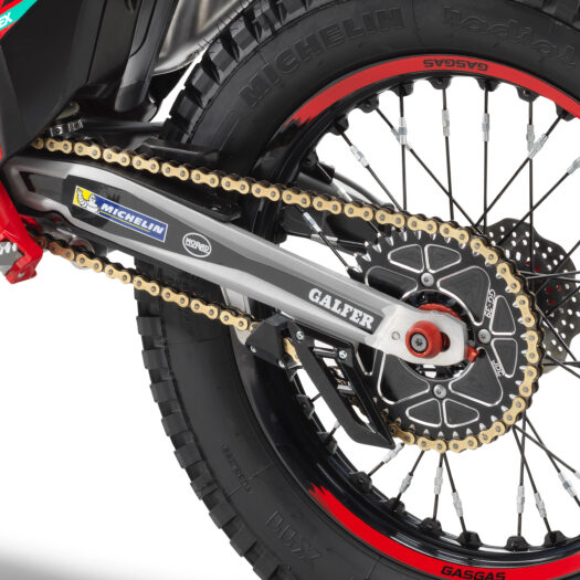 Pro rok 2025 jsme opět zvýšili brzdný výkon naší řady TXT GP a každý motocykl jsme vybavili stejnými kotouči GALFER, jaké používá GASGAS Factory Racing. Vpředu najdete 185mm plovoucí zvlněný kotouč se 4pístkovým třmenem BRAKTEC, zatímco vzadu je 150mm pevný zvlněný kotouč s 2pístkovým třmenem BRAKTEC. Zadní kotouč také splňuje předpisy FIM, takže toto kolo je vhodné pro jakýkoli závod. Instalace zadního kola je také velmi snadná, protože naše patentované magnetické brzdové destičky zůstávají od sebe, takže kotouč se prostě rovnou zasune.