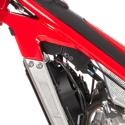 Velmi chytrý integrovaný chladicí systém našich trialových kol TXT Racing je dále vylepšen díky přepracovanému ventilátoru, který zvyšuje průtok vzduchu a snižuje hlučnost. A díky chladiči, který je úhledně schovaný mezi hliníkovými držáky motoru, je celý systém dobře chráněn před poškozením při nárazu a zajišťuje tak trvalý výkon dvoutaktních kol.
