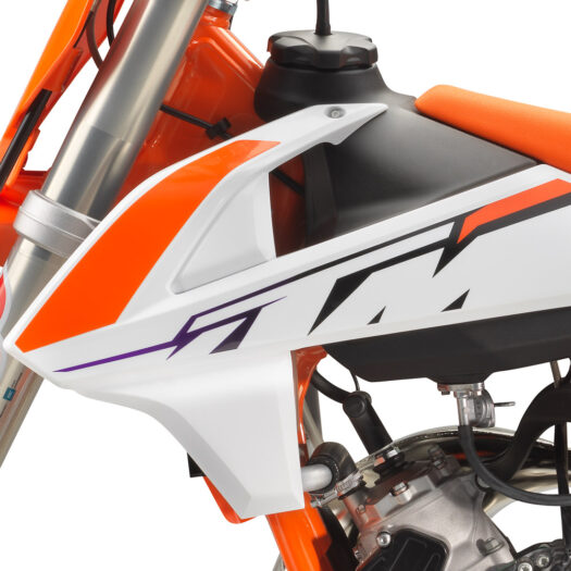 Motocykl KTM 85 SX 2024 zaujme kapotáží v bílo-oranžovém provedení a oranžovým potahem sedla, nechybí však ani odvážná grafika v černém, oranžovém a fialovém odstínu. Už ve startovním boxu tak tento stroj dává najevo své vítězné ambice.