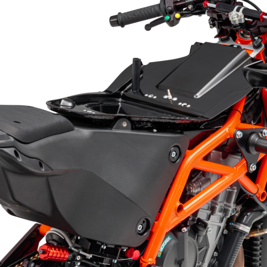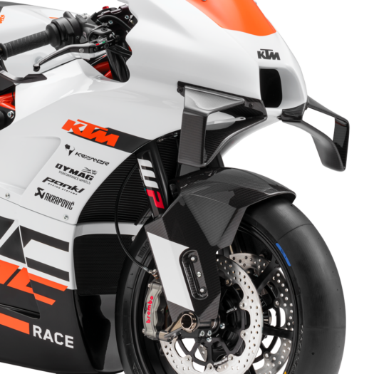 Design a aerodynamickou optimalizaci modelu KTM RC 8C měl na starost stejný tým, který navrhl závodní stroj KTM RC16. Díky kapotáží z ultra pevného a lehkého materiálu GRP vyztuženého karbonovými a kevlarovými vlákny jde téměř o identický stroj jako v závodech GP – včetně stabilizačních wingletů! Tyto prvky zajišťují nejen stabilitu ve vysokých rychlostech, ale také potřebný přítlak, když ho nejvíce potřebuješ. Kryt kyvné vidlice rovněž přispívá k vyššímu přítlaku a také zajišťuje dodatečné chlazení zadní pneumatiky.