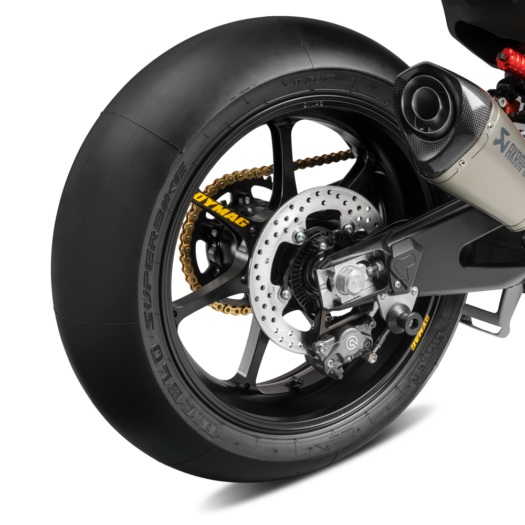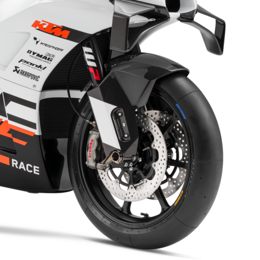 KTM RC 8C přijíždí na lehkých kovaných hliníkových kolech Dymag UP7X obutých do závodních slicků Pirelli Diablo Superbike. Vpředu najdeš pneumatiku o rozměru 120/70R17 NHS SC1 a vzadu 180/60R17 SBK SC1 – s možností upgradu na 200/55/R17, kdyby bylo třeba. A díky ose s rychloupínacím mechanismem můžeš při zastávce v boxech rychle vyměnit kolo, aniž by bylo nutné rozebírat brzdy.