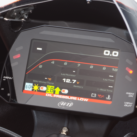 Údaje při jízdě na okruhu znamenají rychlost. Motocykl KTM RC 8C využívá tovární přístrojový panel AIM MXS 1.2 RACE, který funguje také jako nástroj pro záznam dat. Ovládá se prostřednictvím 5′ TFT displeje s integrovanou funkcí pro záznam dat a systémem GPS. Všechna data se ukládají do softwaru AIM Race Studio, který umožňuje jejich pozdější podrobnou analýzu. Zaznamenaná data lze následně analyzovat v softwaru AIM RaceStudio, bez jakýchkoli dodatečných nákladů. Jezdci i mechanici v boxech tak mohou v reálném čase monitorovat rychlost, pozici na okruhu, časy kol, pozici škrticí klapky nebo důležité parametru motoru.