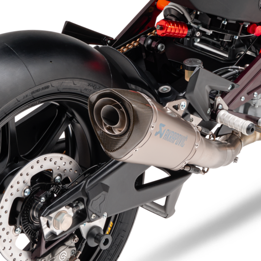 Lehký závodní výfuk Akrapovič s karbonovou koncovkou tlumiče propůjčuje motocyklu KTM RC 8C adekvátní zvukový doprovod. Unikátní zvukový projev modelu KTM RC 8C tak dokonale doplňuje jeho READY TO RACE charakter.