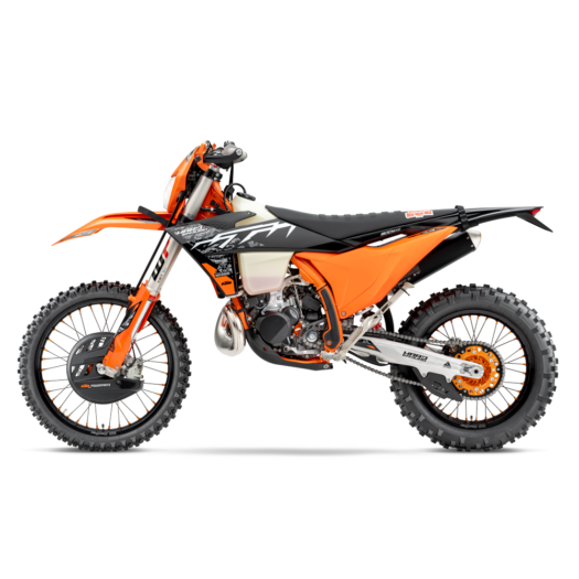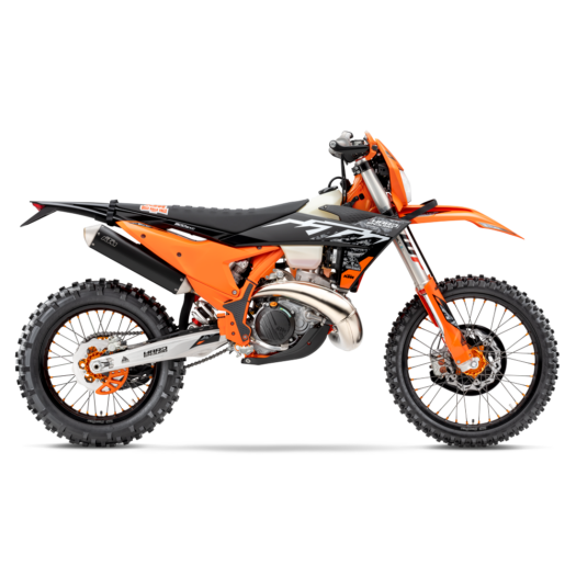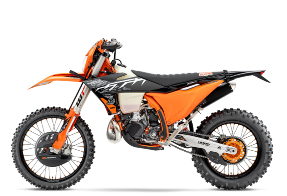 KTM 300 EXC HARDENDURO 2025 zaujme bílo-černou grafikou, žebrovaným černým potahem sedla a černo-oranžovými blatníky, díky nimž tento stroj nepřehlédneš. Tohle grafické provedení nebudeš chtít vyměnit za nic jiného.