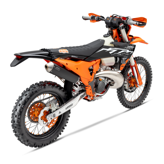 Šťavnatý zvukový projev! Zásluhou nového kompaktnějšího motoru KTM 300 EXC HARDENDURO je sběrné potrubí navrženo s ohledem na vyšší světlou výšku, proto nehrozí jeho poškození při jízdě přes velké kořeny, v hlubokých kolejích nebo v kamenitém stoupání. Tlumič výfuku je vyroben z lehkého hliníku, jenž snižuje hmotnost a dává tomuto stroji, jenž si dokáže s kameny poradit, jako by tam ani nebyly, charakteristický hluboký brumlavý projev dvoutaktu.