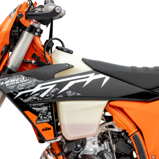 Průsvitná polyethylenová (XPE) palivová nádrž je poznávacím znakem enduro strojů KTM. Tyto nádrže jsou odolné jako tank! Procházejí testováním přímo při závodech, od GNCC až po nejnáročnější enduro podniky FIM. Přívod paliva zajišťují jednodílné palivové čerpadlo a filtr. Snadný přístup k filtru navíc výrazně usnadňuje jeho servis. Modernizované úchyty palivové nádrže nyní zajišťují nádrž pevněji v rámu a zároveň ho chrání před odíráním.