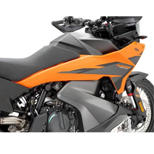Výrazná přední vidlice dodává modelu KTM 790 ADVENTURE pravý READY TO RACE vzhled. Konstrukce pod kapotáží využívá dvě vyztužené hliníkové konzoly, které zajišťují maximální tuhost přední masky, větrného štítku i přístrojového panelu. V kombinaci s odolnou in-mold grafikou a nízko umístěným blatníkem, který eliminuje odstřikující vodu a bláto na minimum, je motocykl KTM 790 ADVENTURE připraven na jakékoli dobrodružství.
