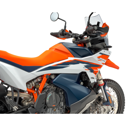 KTM 2025 890 ADVENTURE R jezdí pod nezaměnitelnými KTM R a READY TO RACE barvami, tedy zcela novou bílou, oranžovou a modrou grafikou. Namísto běžných nálepek je grafika vyrobena pomocí technologie in-mold, která nabízí vyšší kvalitu provedení a především odolnost.